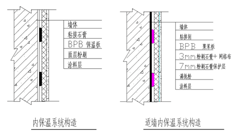 墙体+粘结石膏+XPS保温板+3mm粉刷石膏,A型网格布+7mm粉刷石膏,B型网格布+满批粉+涂料层 |
